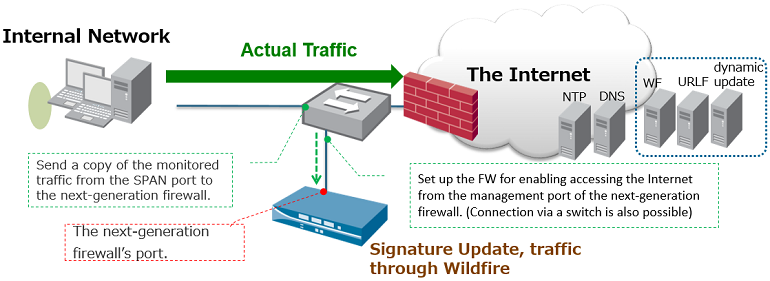 Connect the next-generation firewall to the SPAN port or mirror port of the switch where all traffic between the customer's internal network user and the Internet passes.