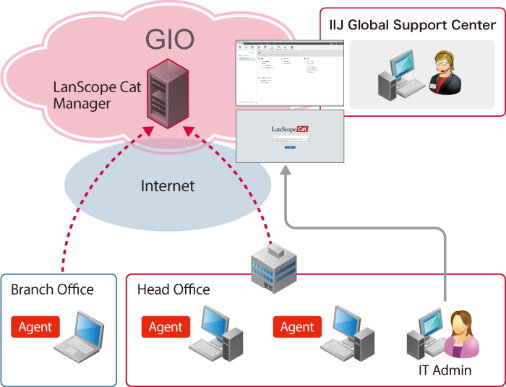 LANSCOPE on GIOは、お客様が保有するクライアントPCにおけるIT資産管理、内部不正対策や外部脅威対策の機能を提供する「LANSCOPE」をSaaSで提供するサービスです。 お客様専用のLANSCOPE管理サーバー(Manager)をIIJ GIO Cloud上に用意するため、お客様がManagerを設置・メンテナンスする必要がなく、初期投資や運用コストを抑えることができます。 また、本サービスではお客様が保有するクライアントPCを管理することができます。 LANSCOPE統合コンソール(管理コンソール)を運用管理担当者のPCへインストールすることで、お客様ネットワーク上にあるクライアントPCを管理するためのルールやポリシーを作成・編集することが可能です。