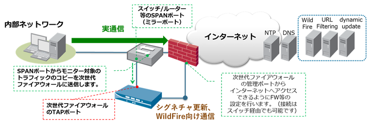 お客様の内部ネットワークユーザーとインターネット間の全通信が通る個所のスイッチの、SPANポート or ミラーポートに、 次世代ファイアウォールを接続します。